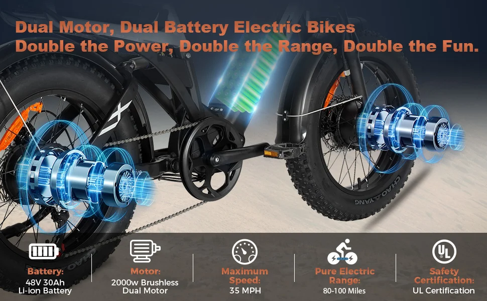 With dual 1000W motors that peak at an impressive 3000W, this electric bike delivers a remarkable 150Nm of torque. Effortlessly tackle steep hills, snow, sand, or gravel with ease. Seamlessly switch between front, rear, or dual motor drive to achieve the perfect balance of speed and traction tailored to any adventure.