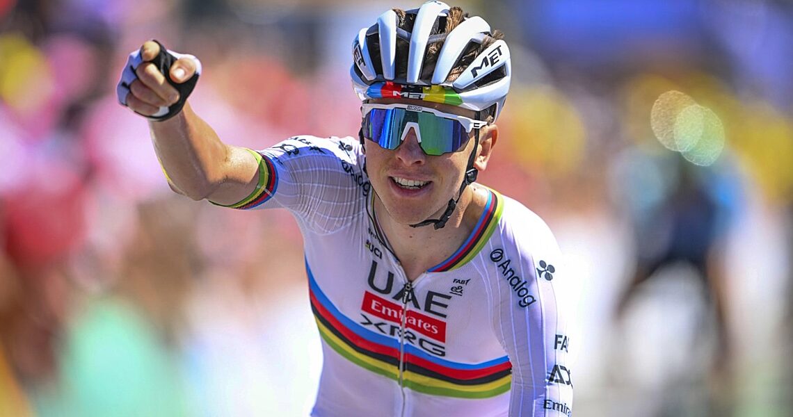 Tim Wellens (UAE Emirates XRG) leads Pogačar at the bottom of the ascent (2km at 6.9% with gradients up to 15%). After a first acceleration from the Slovenian, nine riders face off in the final sprint… And nobody can match Pogačar’s pace when he sprints to the line ahead of Vingegaard and Picnic PostNL’s Oscar Onley at 2 seconds.